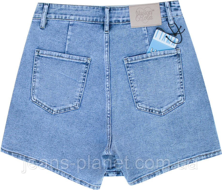 • Наймодніша модель сезону Літо 2025! Оригінальні шорти — спідничка ошатного світло-синього кольору на гудзиках. Посадка висока, штанці шортиків вільні, передні полички, що імітують спідницю застібаються на гудзики.