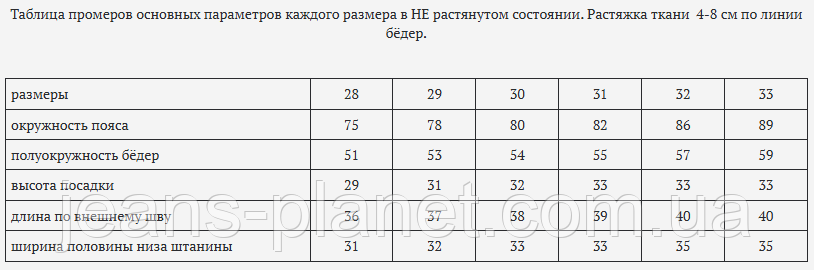 | ширина половини низу штанини | 31 | 32 | 33 | 33 | 35 | 35 |