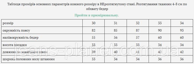 | розмір | 30 | 31 | 32 | 33 | 34 |