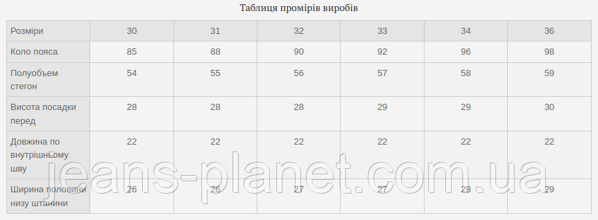 | Ширина половини низу штанини | 27 | 27 | 28 | 29 |