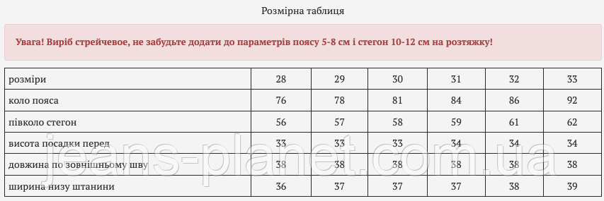 - Більш детальну інформацію про товар і про те, як правильно визначити свій розмір, дивіться на нашому сайті Jeans Planet.