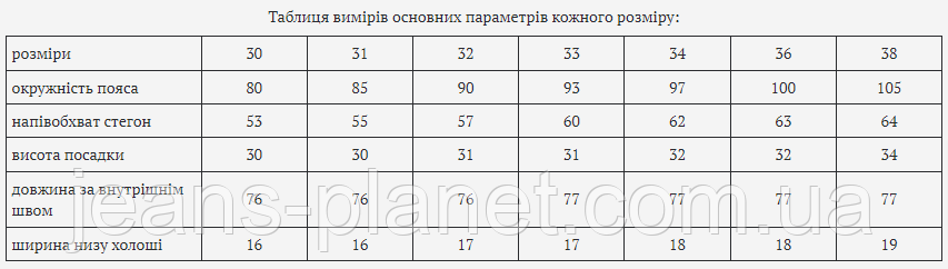 | розміри | 30 | 31 | 32 | 33 | 34 | 36 | 38 |