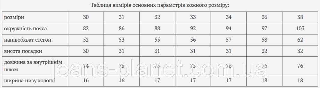 | розміри | 30 | 31 | 32 | 33 | 34 | 36 | 38 |