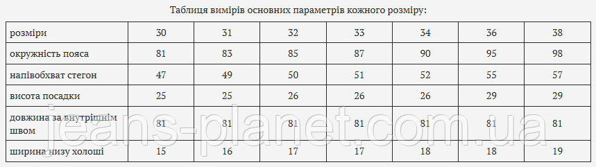 | розміри | 30 | 31 | 32 | 33 | 34 | 36 | 38 |