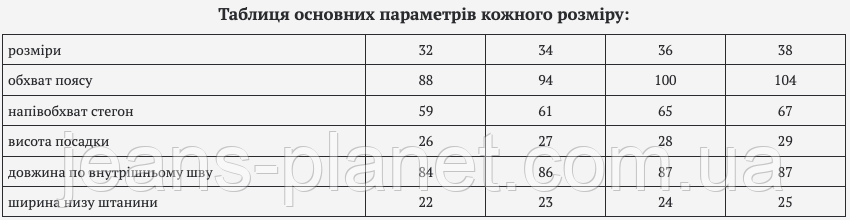 | ширина низу штанини | 20 | 20 | 20 | 21 | 21 | 22 |