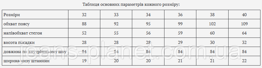 | ширина низу штанини | 19 | 20 | 20 | 21 | 21 | 22 |
