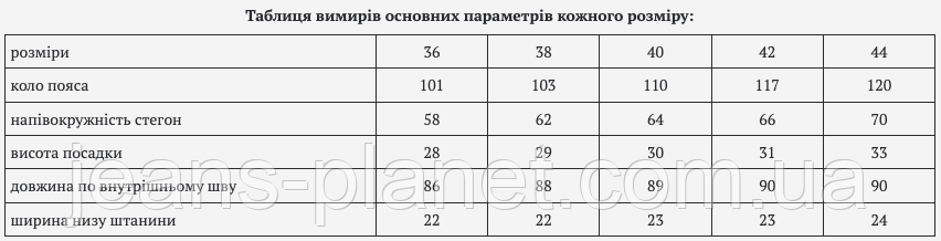 | ширина низу штанини | 22 | 22 | 23 | 23 | 24 |