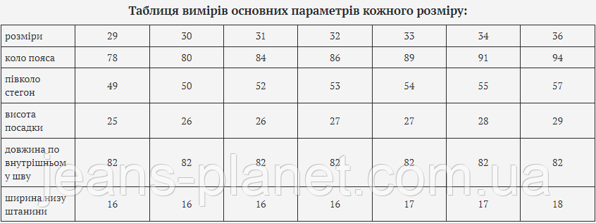 | ширина низу штанини | 16 | 16 | 17 | 17 | 18 |