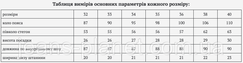 Таблиця вимірів основних параметрів кожного розміру: