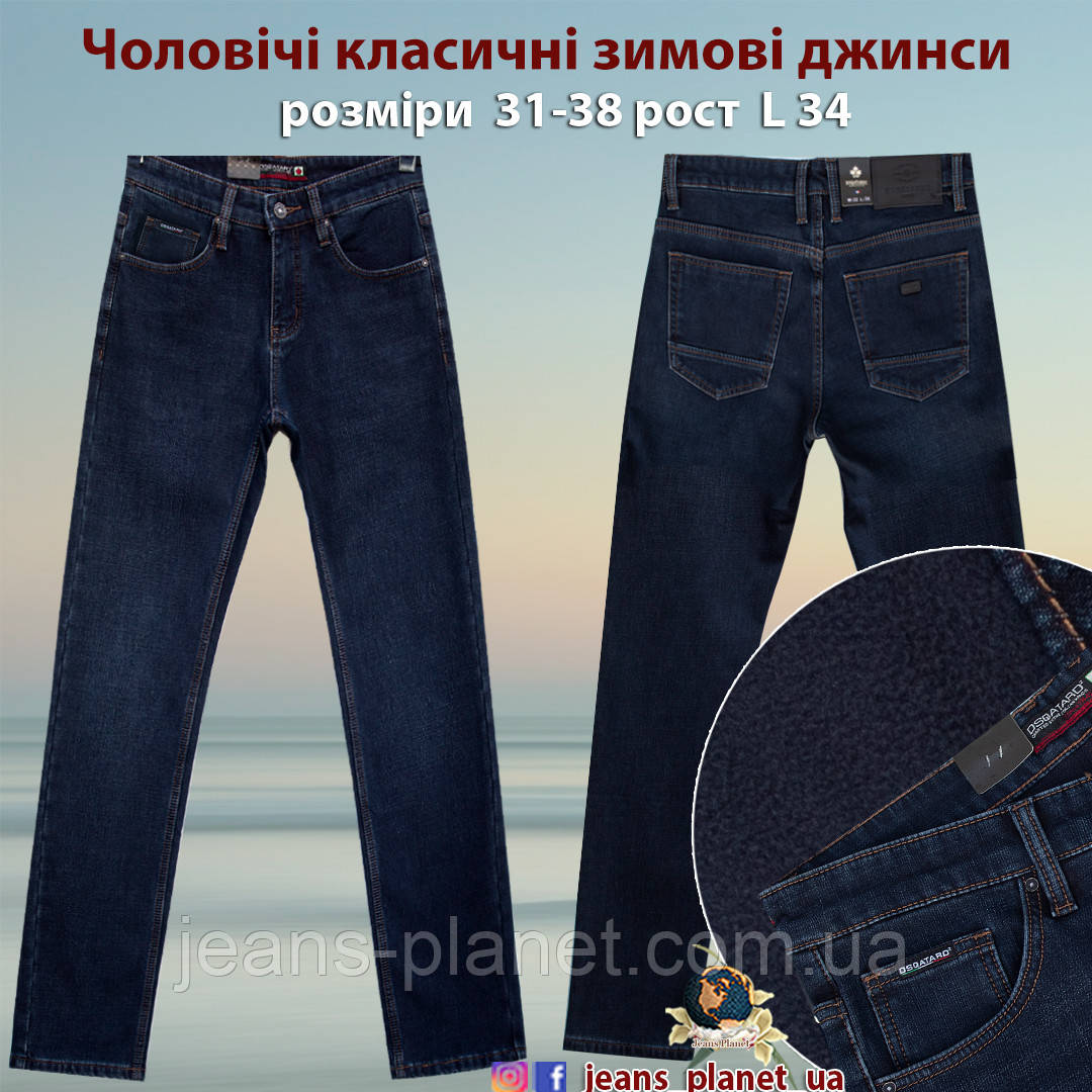- Якісні чоловічі джинси прямого крою темно-синього кольору утеплені флісом.