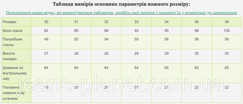 Перегляньте наше відео, як користуватися таблицею, зробіть свої виміри і залиште їх у коментарі до замовлення