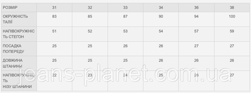 | ДОВЖИНА ШТАНИНИ | 25 | 25 | 25 | 26 | 26 | 26 |