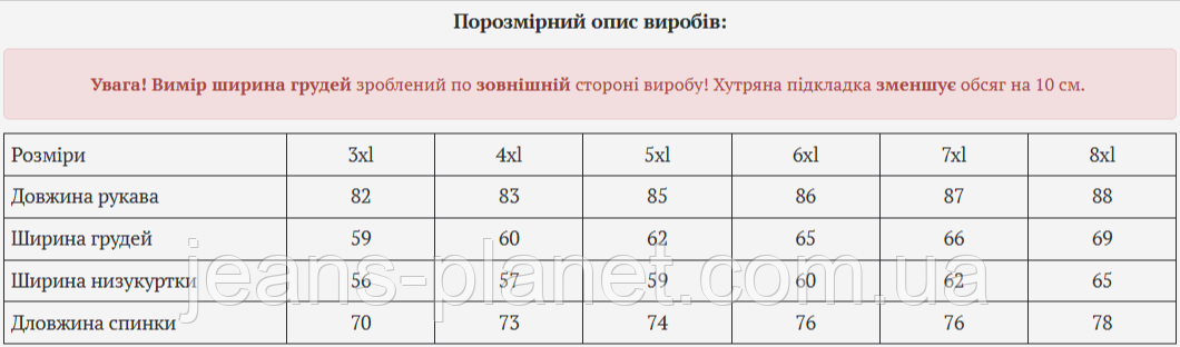 - Розмірний ряд 3XL-8XL що відповідає українським розмірами 50-60