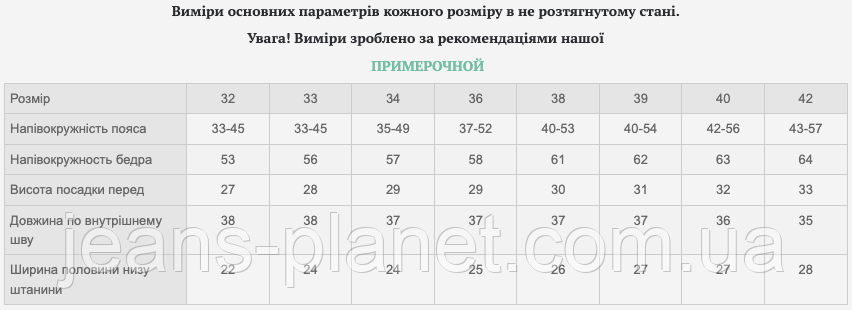 Виміри основних параметрів кожного розміру в не розтягнутому стані.