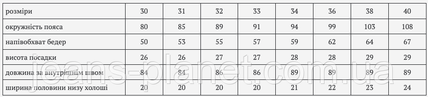 | розміри | 30 | 31 | 32 | 33 | 34 | 36 | 38 | 40 |