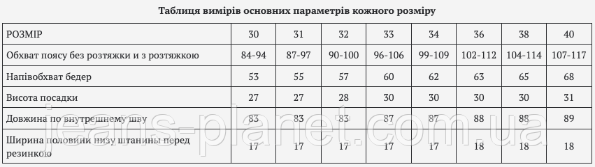 | РОЗМІР | 30 | 31 | 32 | 33 | 34 | 36 | 38 | 40 |