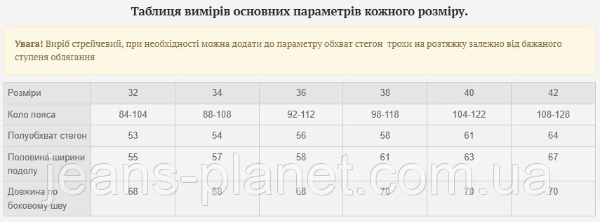 | Розміри | 32 | 34 | 36 | 38 | 40 | 42 |