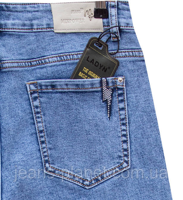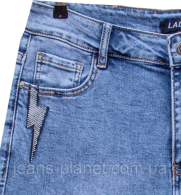 - Модель пошита из качественной, стрейчевой джинсовой ткани практически однотонного голубого цвета. Под передним и задним правыми карманами рисунок молния из мелких металлических стразиков