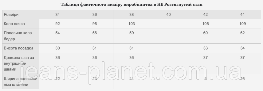 Таблица фактических замеров изделий в НЕ растянутом состоянии